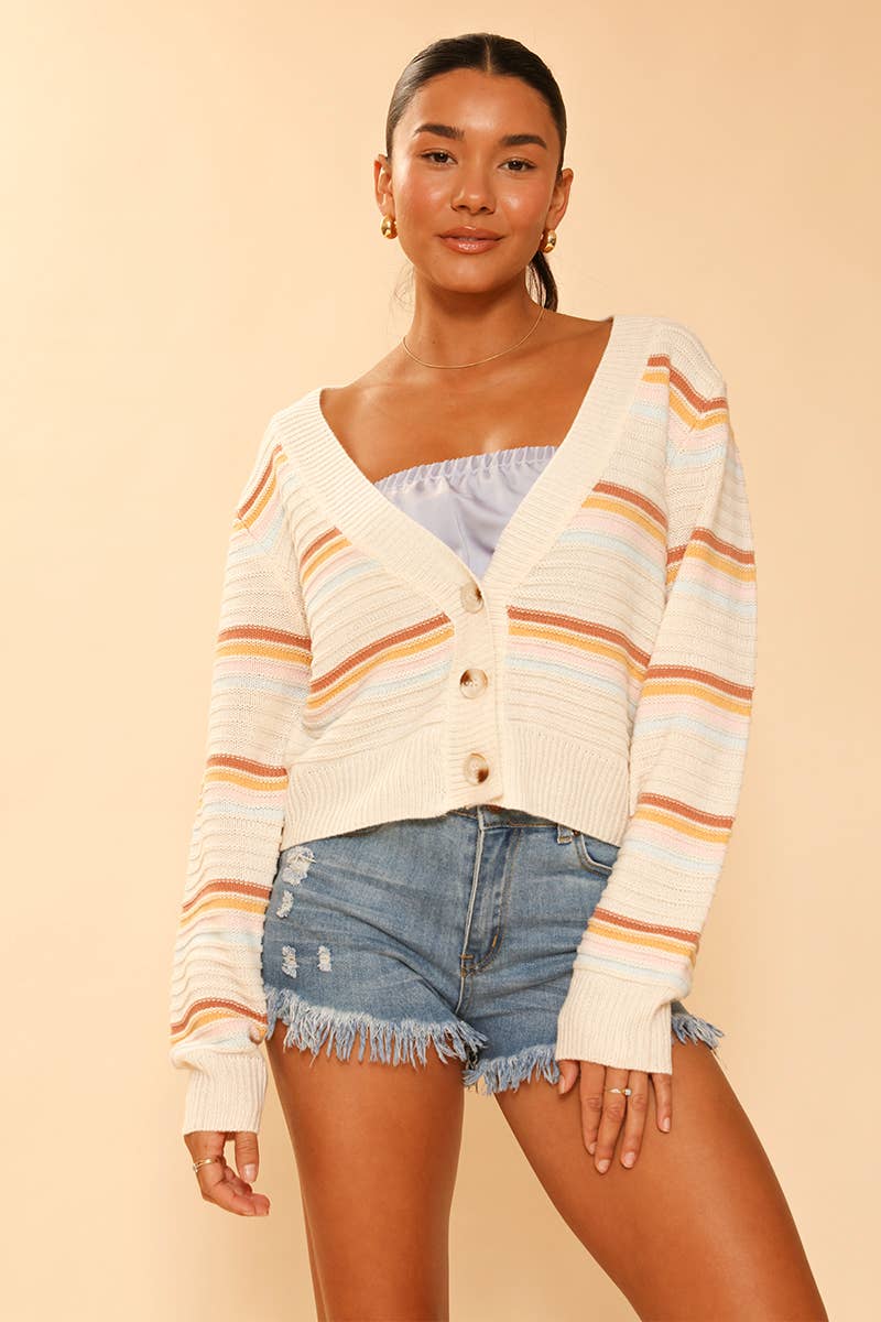 Make a statement in our Exclusive In-House Design — the Retro Revival Cropped Cardigan. This one-of-a-kind piece features vibrant retro stripes, a button-front closure, and a flattering V-neckline that adds a playful yet polished touch to any look.
