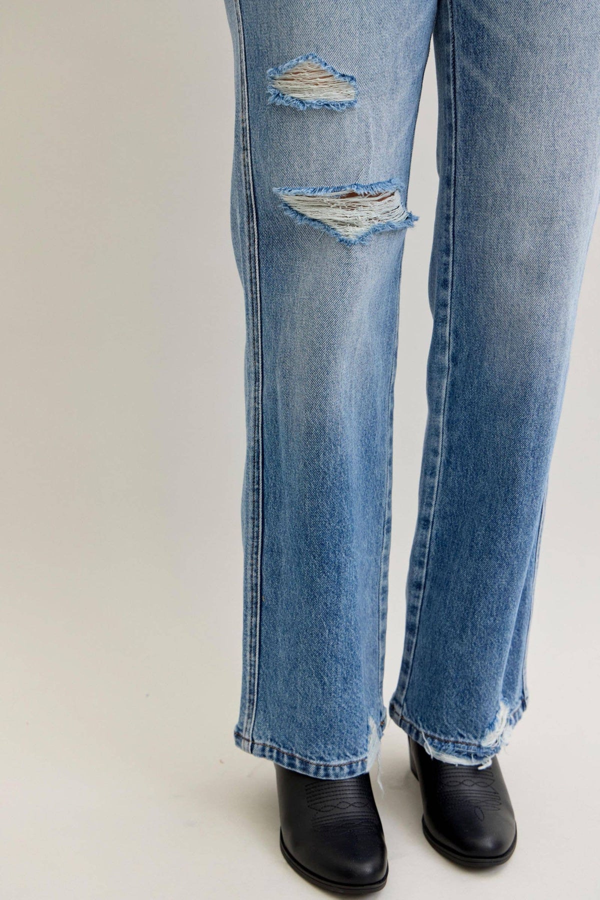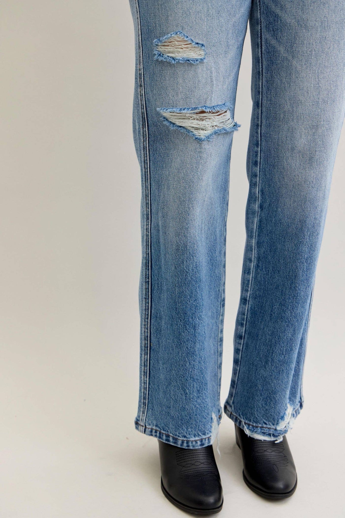 The straight leg silhouette and edgy distressing at the knee and hem create that perfectly worn-in look you love. With a flattering mid-rise fit, these jeans are your go-to for easy, laid-back style โ whether youโre pairing them with sneakers, boots, or a cozy knit top.
